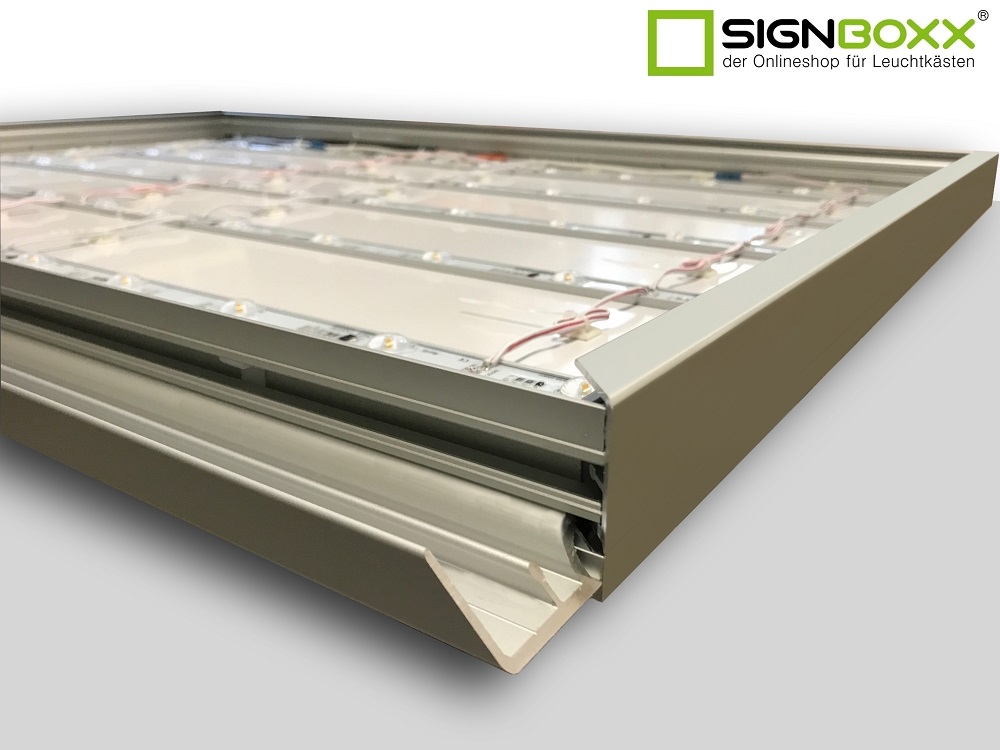 Für Leuchtkästen im Innenbereich können wir zwei Scheiben, ein Acrylglas opalweiß und eine zweite transparente Scheibe zum Einlegen von Backlitdrucke zwischen 2 Scheiben verwenden.