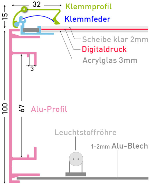 Für Leuchtkästen verwenden wir zwei Scheiben, ein Acrylglas opalweiß und eine zweite transparente Scheibe für Dias.