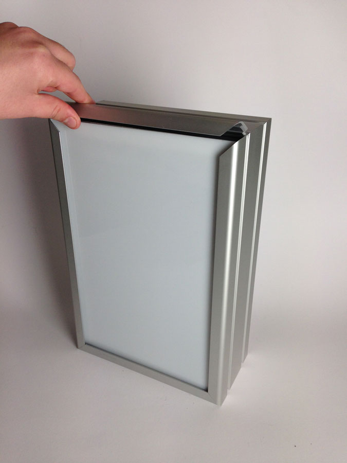 Auf zwei Seiten (einmal kurze, einmal lange Seite) installieren wir aufklappbare Leisten mit von außen nicht sichtbaren Scharnieren. Sie haben die Wahl, ob Sie die Leisten mit versenkten Gewindeschrauben öffnen/schließen können möchten oder mit Magneten. Das Öffnerprofil ermöglicht das einfache Ausstauschen von Acrylglasscheiben und Dia-Folien.